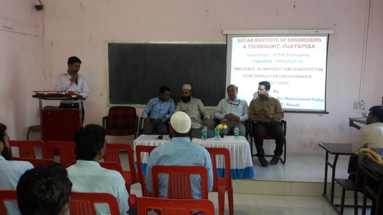 A One day Colloquium has been organized by department of civil & mechanical engineering. Speaker Dr. Mohammad Talha Asst.Professor IIT. Mandi delivered the topic on Influence of Imperfection Sensitivity on Functionally Graded Sandwich Structures & its applications in various fields of engineering. The one day colloquium provided basic idea and innovation in the field of composite structures. Faculties and students of civil and mechanical department showed interest towards the topic and obtained beneficial knowledge which can be further utilized for their Research work.