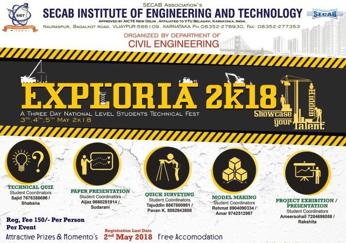 Exploria 2K18 “A national level student’s technical fest” organized by civil engineering students and staff. A three day national level student’s technical fest provides a platform for sharing knowledge, skills in engineering and technology. Various events were organized during these three days which included paper presentation, model making, technical quiz, project exhibition and quick surveying. Participants from various engineering colleges around Karnataka and other states actively participated and won the prizes. On 3rd May the inauguration function was presided by Shree S.A.Punekar President S.I.E.T, Bijapur,) Dr Noorullah Shariff, Principal and Prof M. H. Kolhar, HOD (Civil).