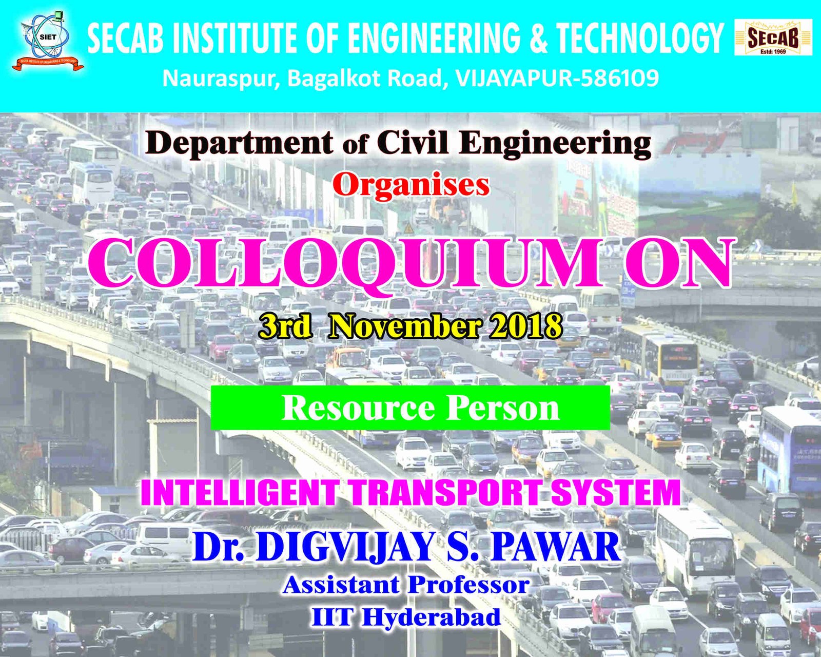 Civil Engieering Department conducted a colloquium on 03 Nov. 2018 titled "Intelligent Transport System" by Prof. Digvijay S. Pawar Assistant Professor IIT Hyderabad. He elaborated on the 'Goals of Intelligent transport system, Traffic Management, Active Traffic Management, System Engineering process and Intelligent Transportation System. Students and faculties were greatly benifited from his lecture.