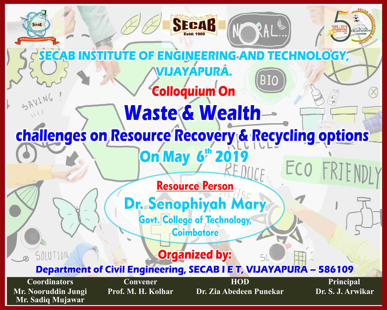 Department of civil engineering organised a colloquium on 6th may 2019 entitled "Waste & Wealth: Challenges on resource recovery and recycling options". The talk was delivered by Dr. Senophiya Mary, technical advisor for Green Era Recycling Pvt. Ltd. She elaborated waste management topics like Importance of 3R's, Challenges on resource recovery & recycling, E-waste, Wealth from the Waste, Treatment techniques of E-waste etc. The department was hugely benefited by the valuable talk given by Dr. Senophiyah.