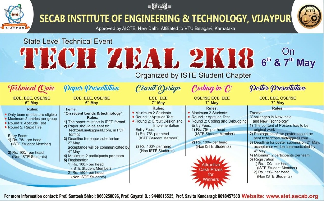 Technical fest "Tech-Zeal 2k18", organised under ISTE student chapter which will be held on 6th and 7th may 2018 in SECAB I E T Vijayapura for CSE,ISE,ECE and EEE students.