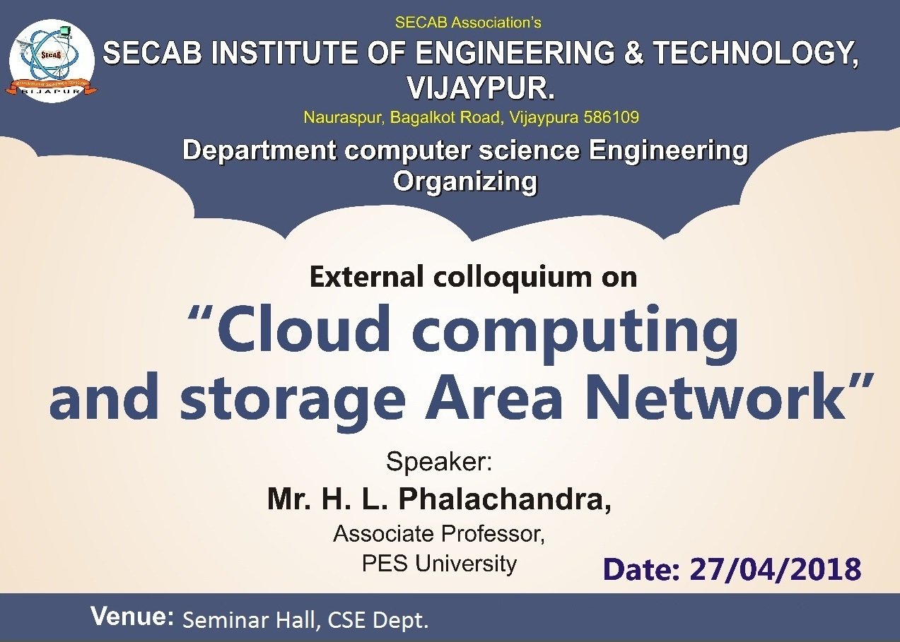 The department of CSE organized research colloquium “Cloud computing & Storage Area Network†on 27th April 2018. The event started with formal inaugural function graced by the presence of dignitaries Mr. H L Phalachandra Associate Professor, PES University Bangalore, Principal SECAB I. E. T, and HOD CSE, SECAB I. E. T.