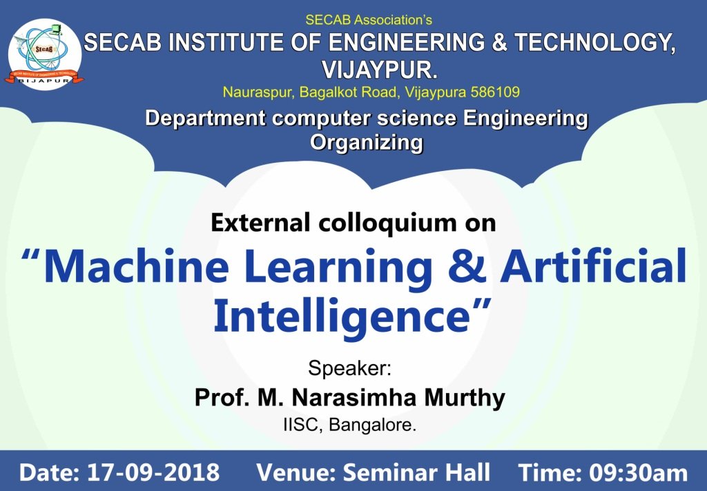 The department of CSE organized research colloquium “Machine Learning & Artificial Intelligence†on 17th September 2018. The event started with formal inaugural function graced by the presence of dignitaries Dr. Narasimha Murty Musti Professor, Indian Institute of Science Bangalore, Principal SECAB I. E. T, and HOD CSE, SECAB I. E. T.