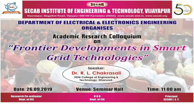The department of Electrical and Electronics Engineering SECAB I.E.T organized an academic research Colloquia on " Frontier Developments in SMART GRID Technologies" on 26th September 2019 .The guest speaker was Dr.R.L.Chakrasali ,who is presently working as a professor,Dept of EEE SDM college of Engineering &Technology ,Dharawad.