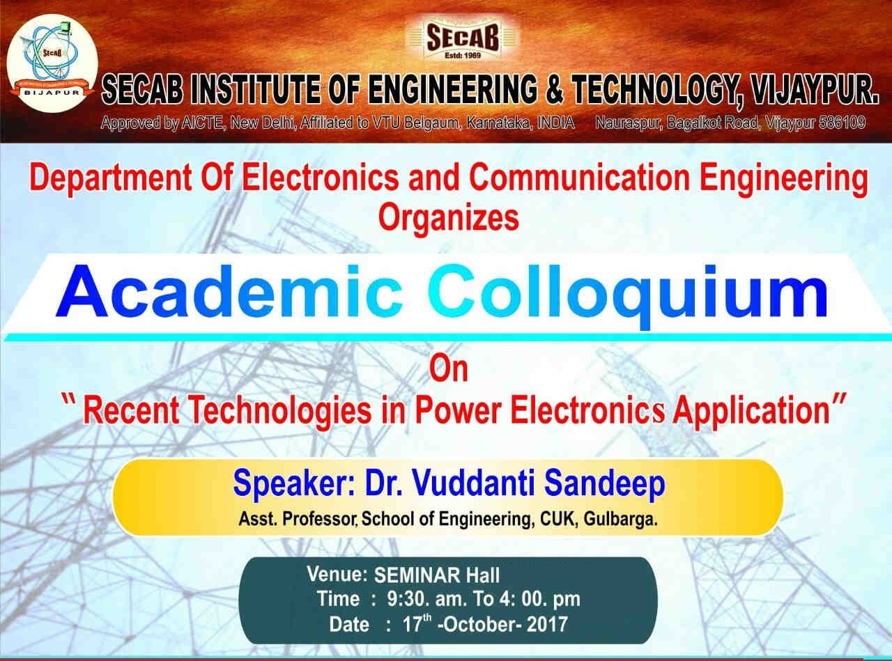 The department of ECE organized research colloquium under AVISHKAR Club on 17th October 2017. The event started with formal inaugural function graced by the presence of dignitaries and Speaker Dr. Vuddanti Sandeep, Asst. Professor in School of Engineering, Central University Karnataka, Kalburgi, KARNATAKA, India . Dr. Vuddanti Sandeep gave a talk on Recent Technologies in Power Electronics Application”