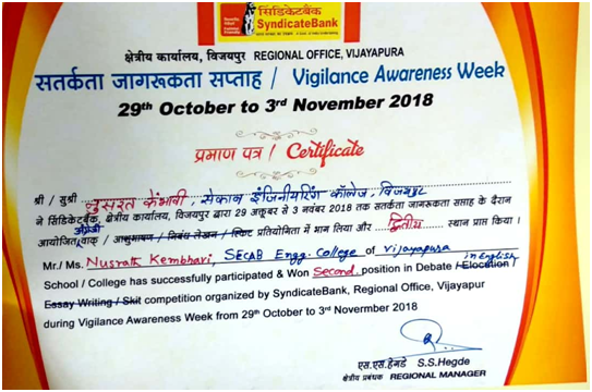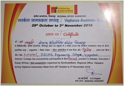 The students of ECE Department secured 3 prizes during "Vigilance Awareness Week" organized by Syndicate Bank, Regional office, Vijayapura on 29th October 2018.