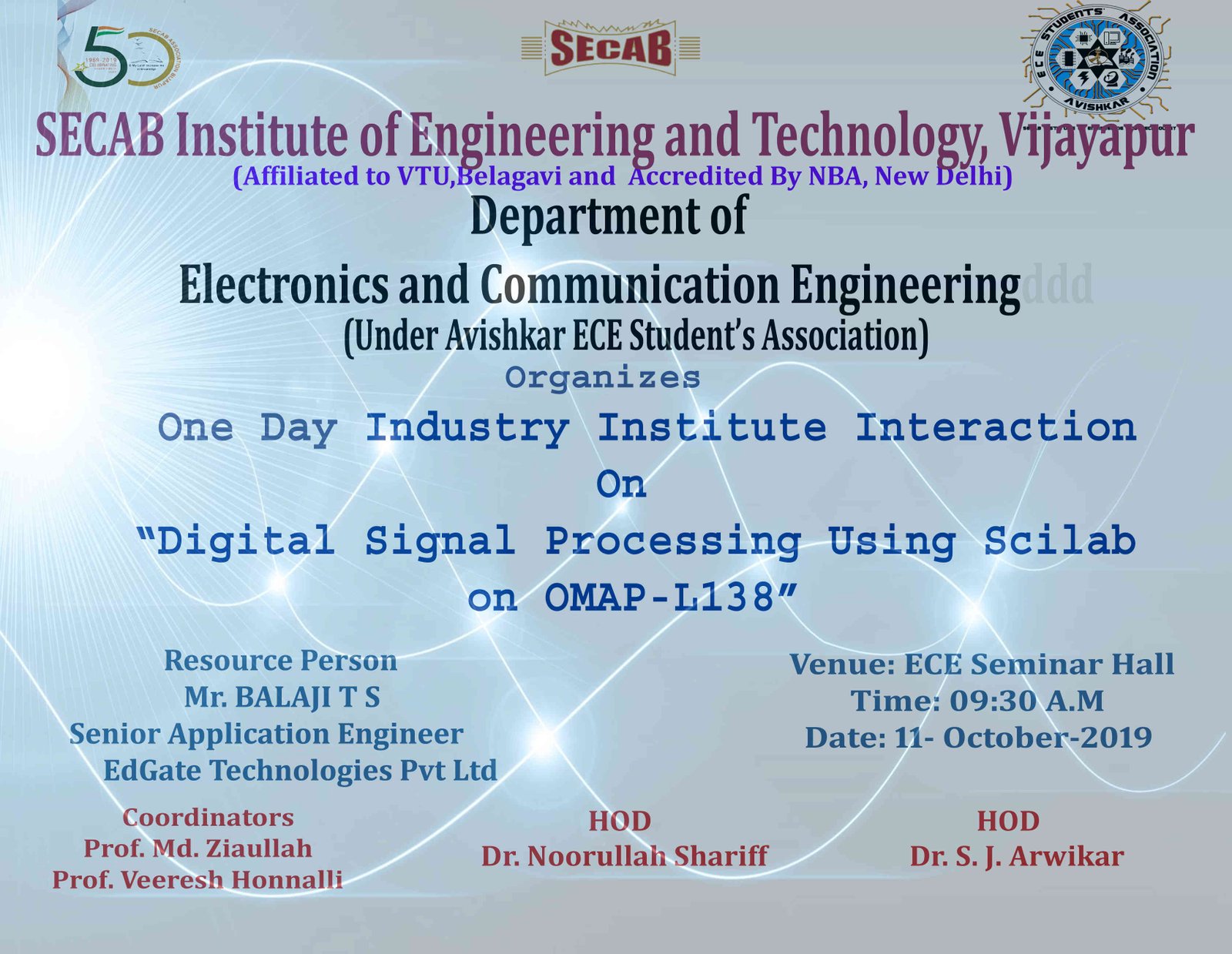 As an Industry institute Interaction, Department of Electronics & Communication Engineering has organized a Technical talk & Hands-on session on "DSP using Scilab on OMAP-L138" on 11/10/2019. The resource person was Mr. Balaji T.S, Senior Application Engineer, EDGATE Technologies Pvt. Ltd, Bengaluru.