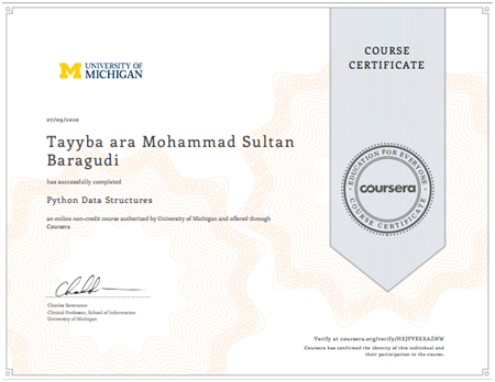 Miss. Tayyaba ara Mohammad Sultan Baragudi,5th Semester, Dept of ECE has completed an online course on "Python Data Structures" authorized by University of MICHIGAN and Offered through Coursera on 7th September, 2020.
