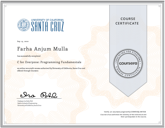 Miss. Farha Anjum Mulla of 3rd Semester, ECE dept. has completed an online course on "C for Everyone : Programming Fundamentals" authorized by University of California, Santa Cruz and Offered through Coursera on 13th September, 2020.