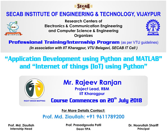 The department of Electronics & Communication Engineering has organized Three week Internship program in association with Right Brain Mapping, IIT Kharagpur from 20th July 2018 to 4th August 2018 on "Application Development using Python and MATLAB" and "Internet of Things using Python". The Resource Person was Mr. Rajeev Ranjan, Project Lead, RBM, IIT Kharagpur.