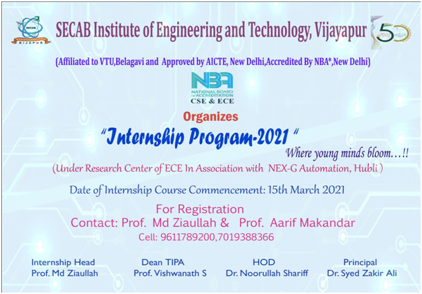 The department of Electronics & Communication Engineering has organized Three week Internship program in association with NEX-G Automation Hubli and AMSA Embedded solutions Hubli on "Application Development using Arduino & Raspberry pi" from 15th March 2020 to 3rd April 2020.