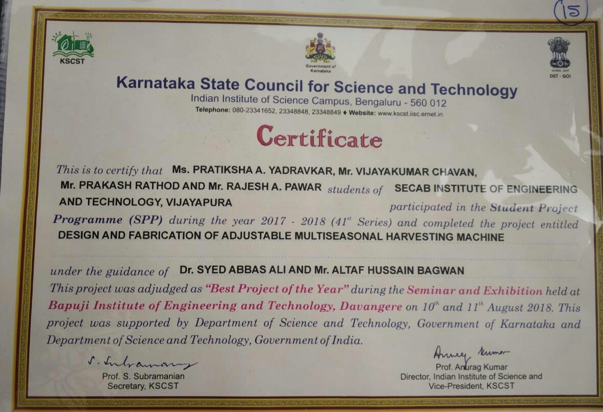 on the Project "DESIGN AND FABRICATION OF ADJUSTABLE MULTI SEASONAL HARVESTING MACHINE" during the seminar and exhibition held at Bapuji institute of Engg & Technology, Davangere on 10th and 11th August-2018. Organized by Karnatak state council for science & Technology, Bengaluru.